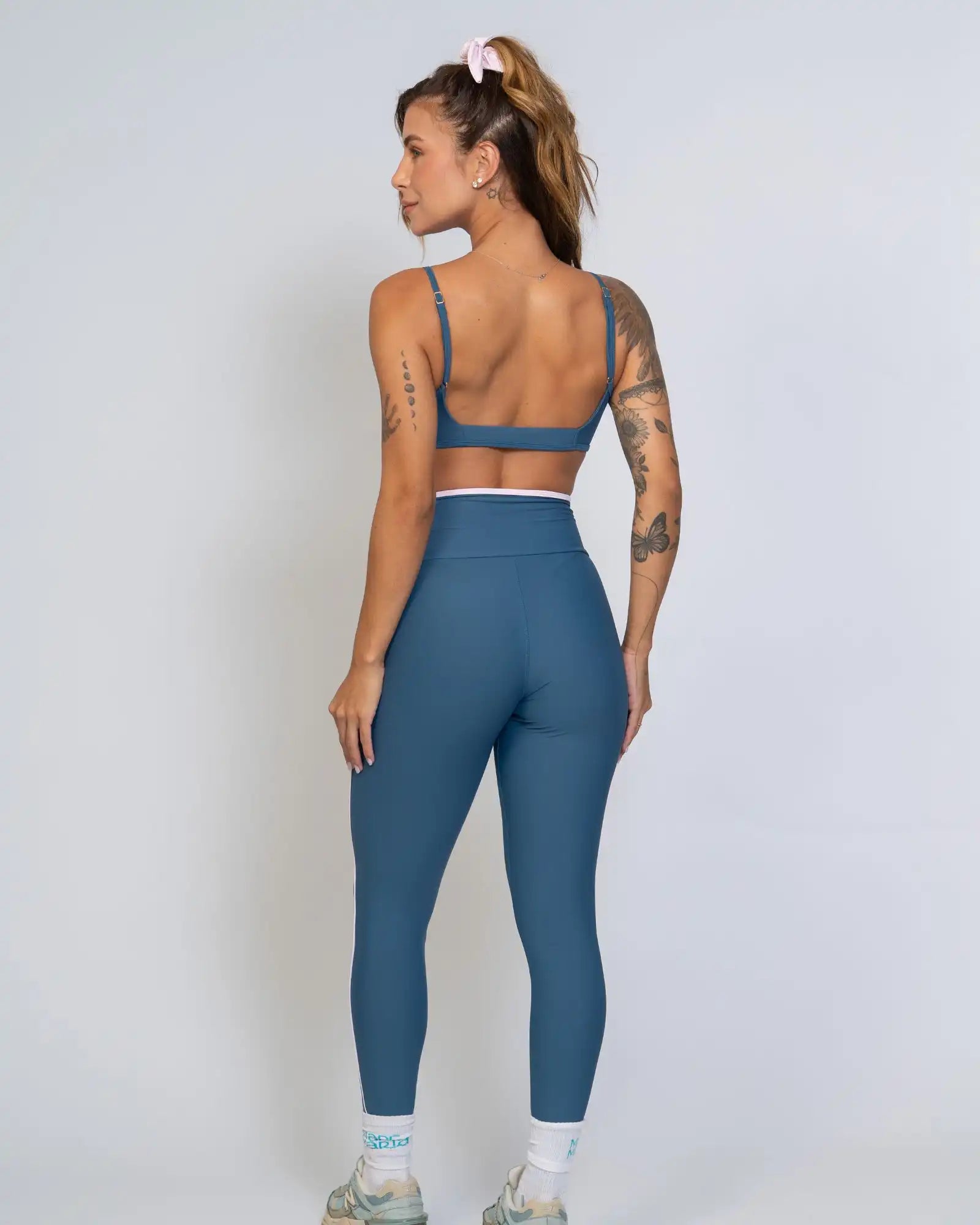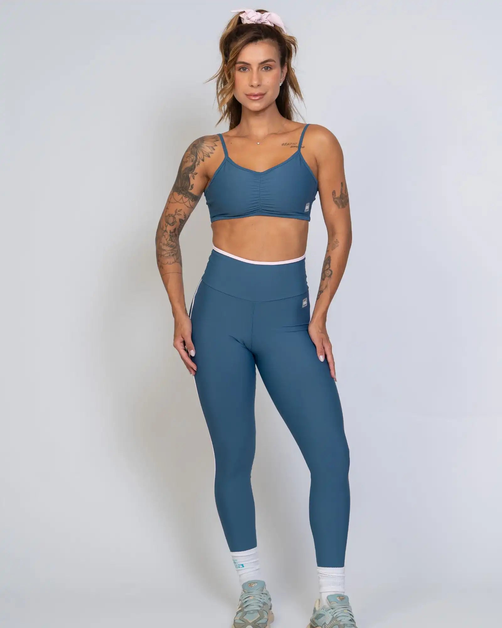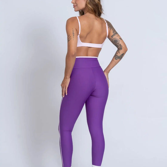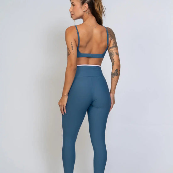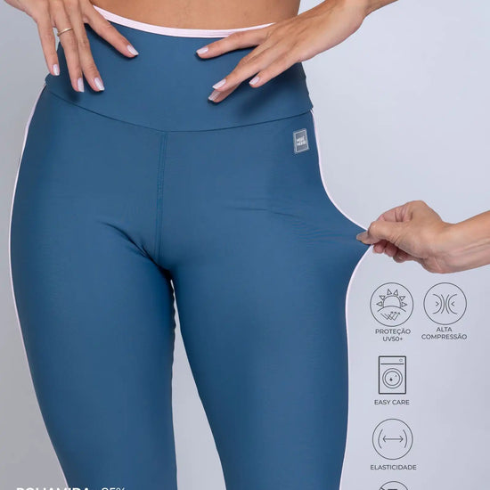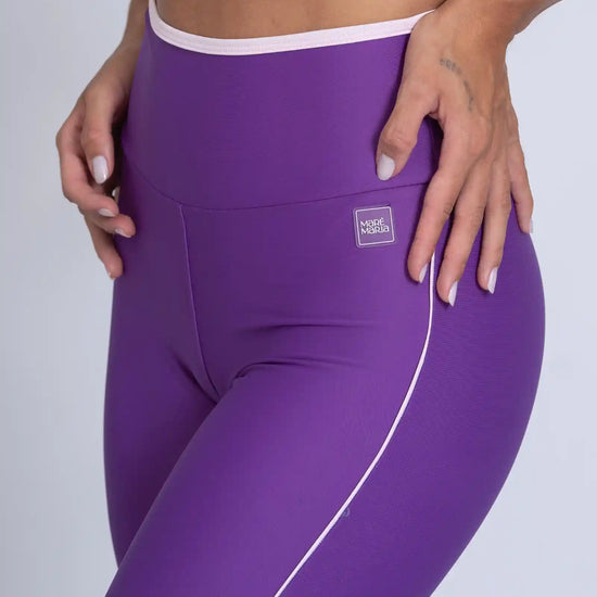 Disponível nas cores Azul Maré e Roxo Vibrante, ambos com detalhes em Rosa Blush que valorizam o visual com um toque feminino e moderno. O acabamento em viés no cós e vivo lateral alonga a silhueta e cria um contraste elegante, reforçando o DNA premium da peça.