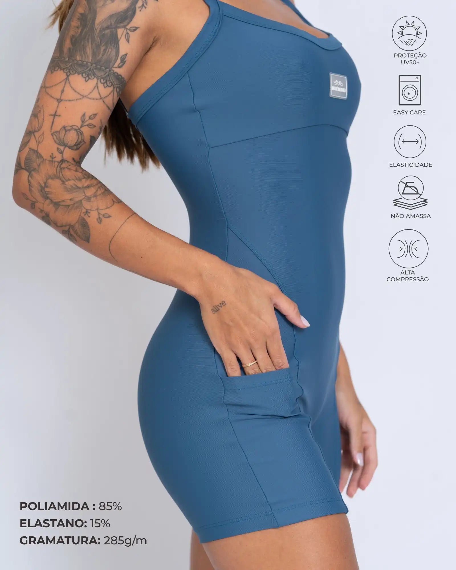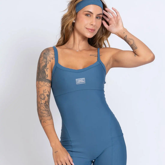 Na parte superior, o busto é valorizado com costura abaixo do seio e estrutura interna com entrada para bojo opcional, oferecendo sustentação suave. As alças são mais largas e firmes, sem reguladores, garantindo conforto sem apertos durante os movimentos.