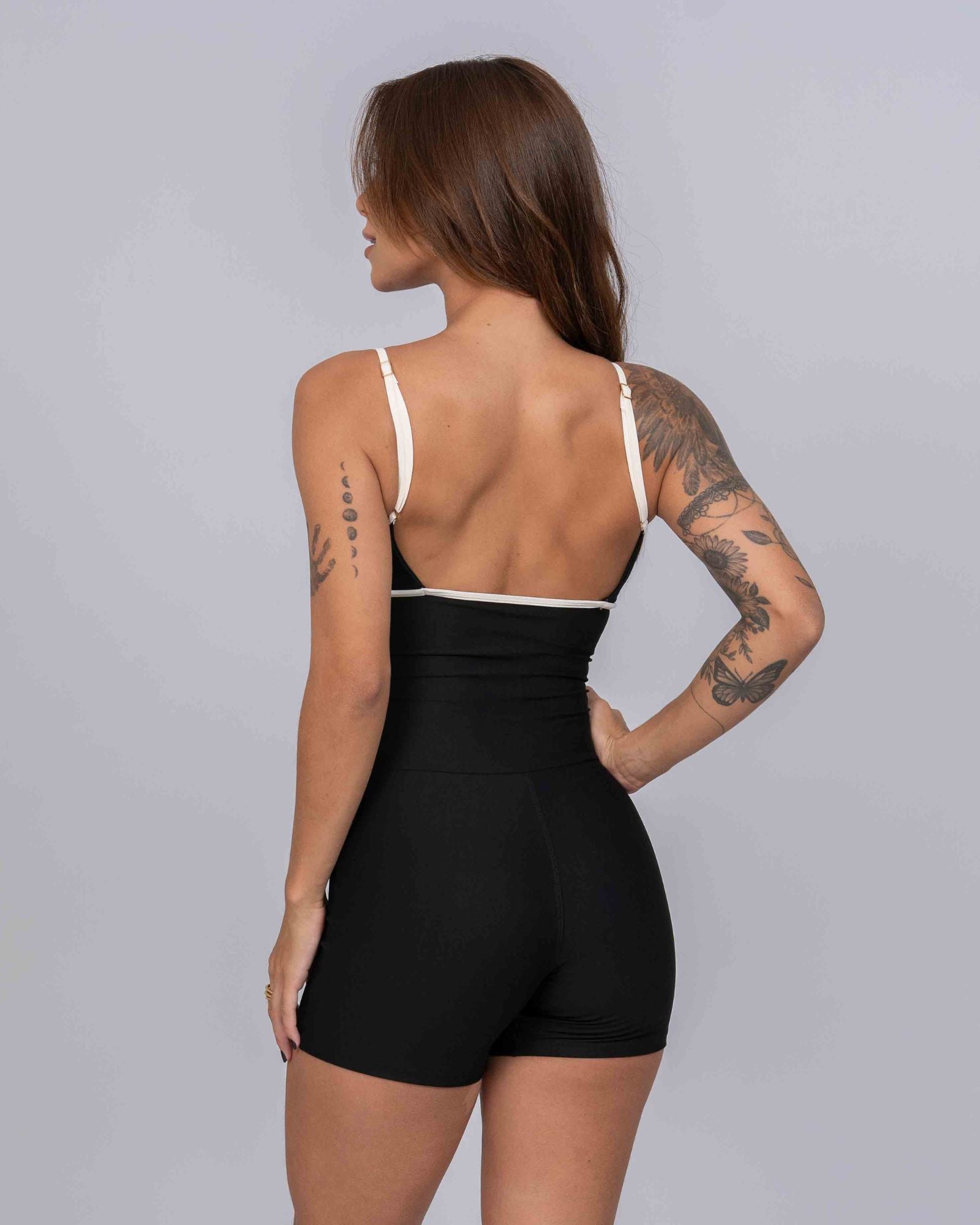 Macaquinho Fitness Mood Super Black com Off White Compressão sem empina