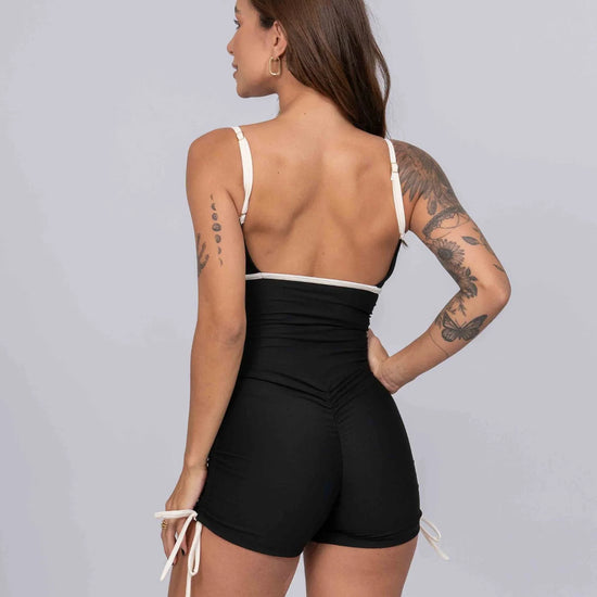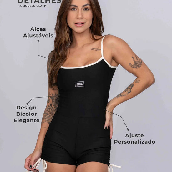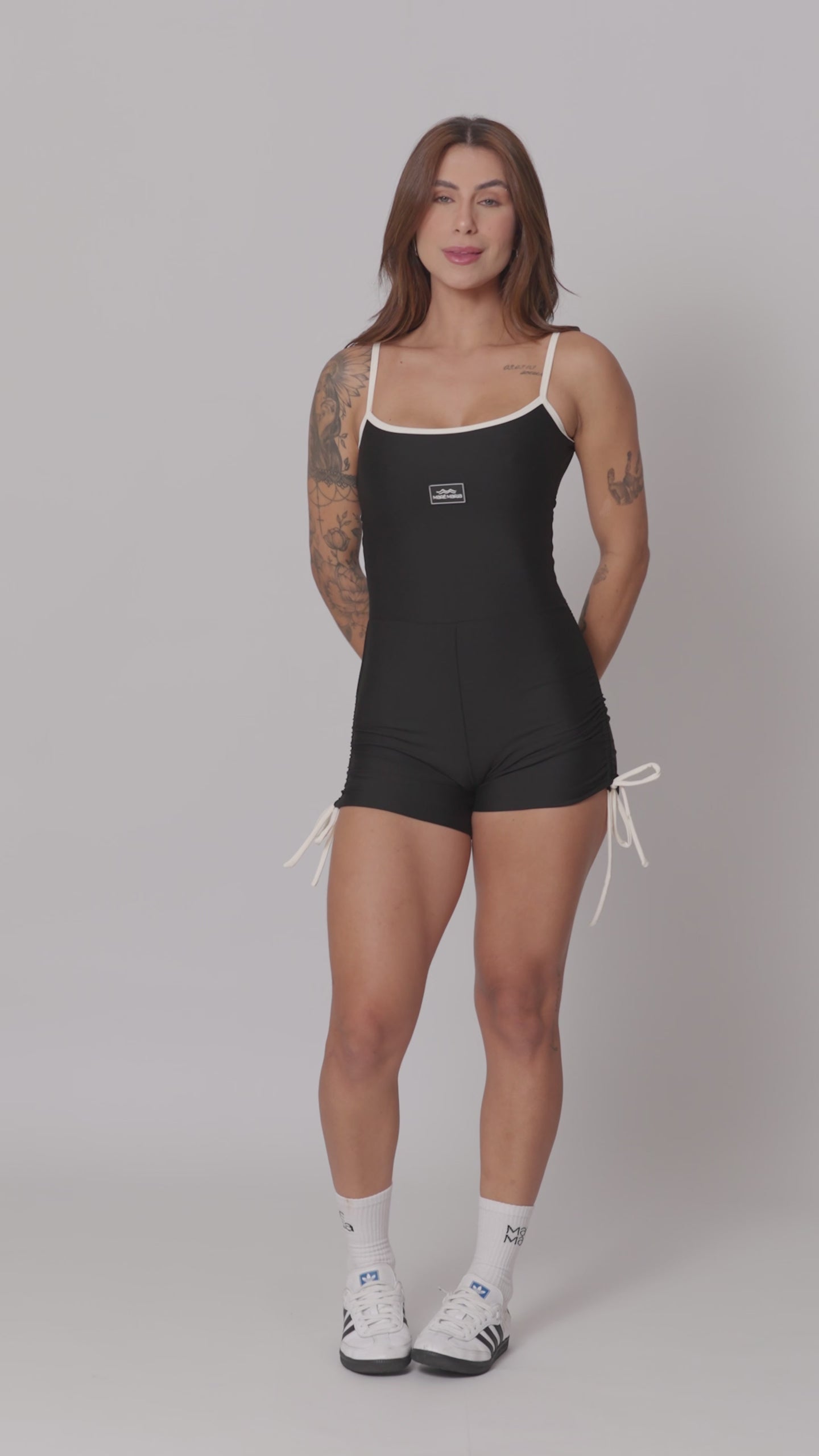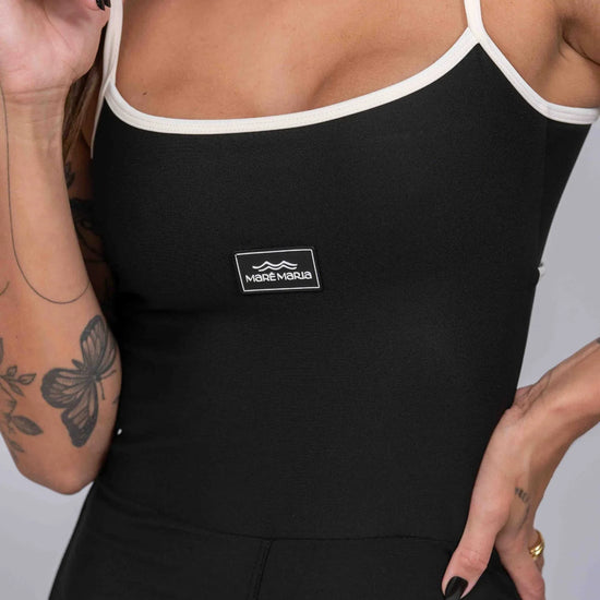 Macaquinho Fitness new Pérola Super Black e viés Off White empina bumbum