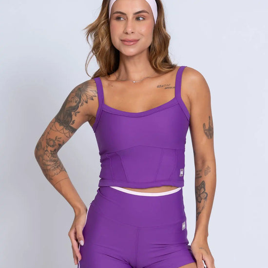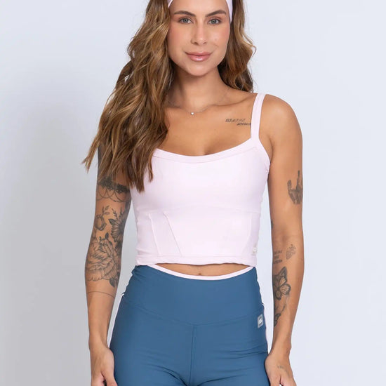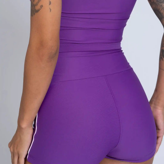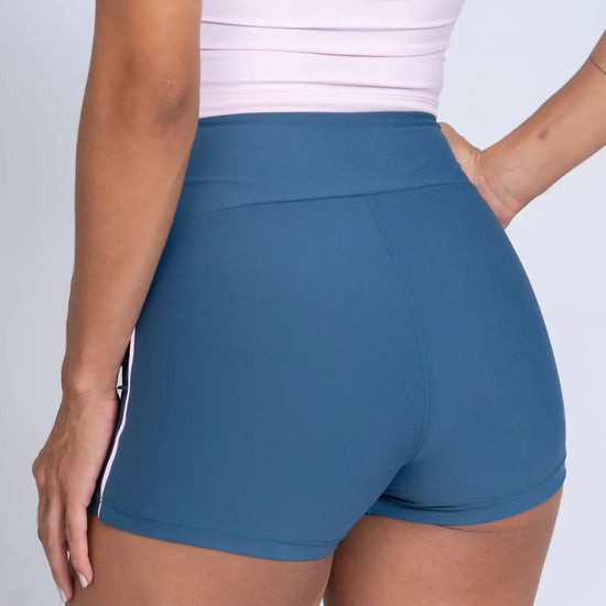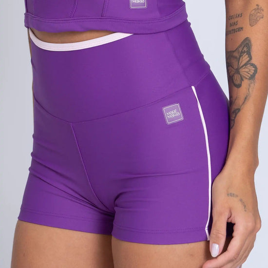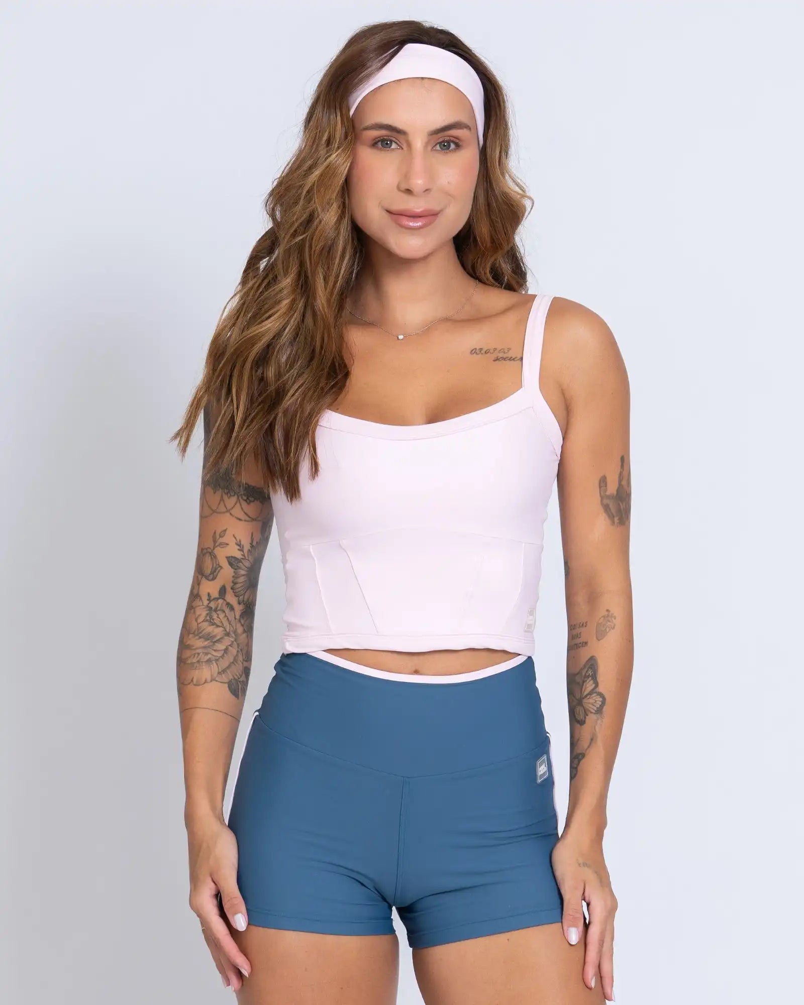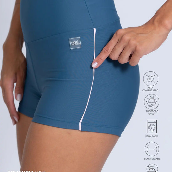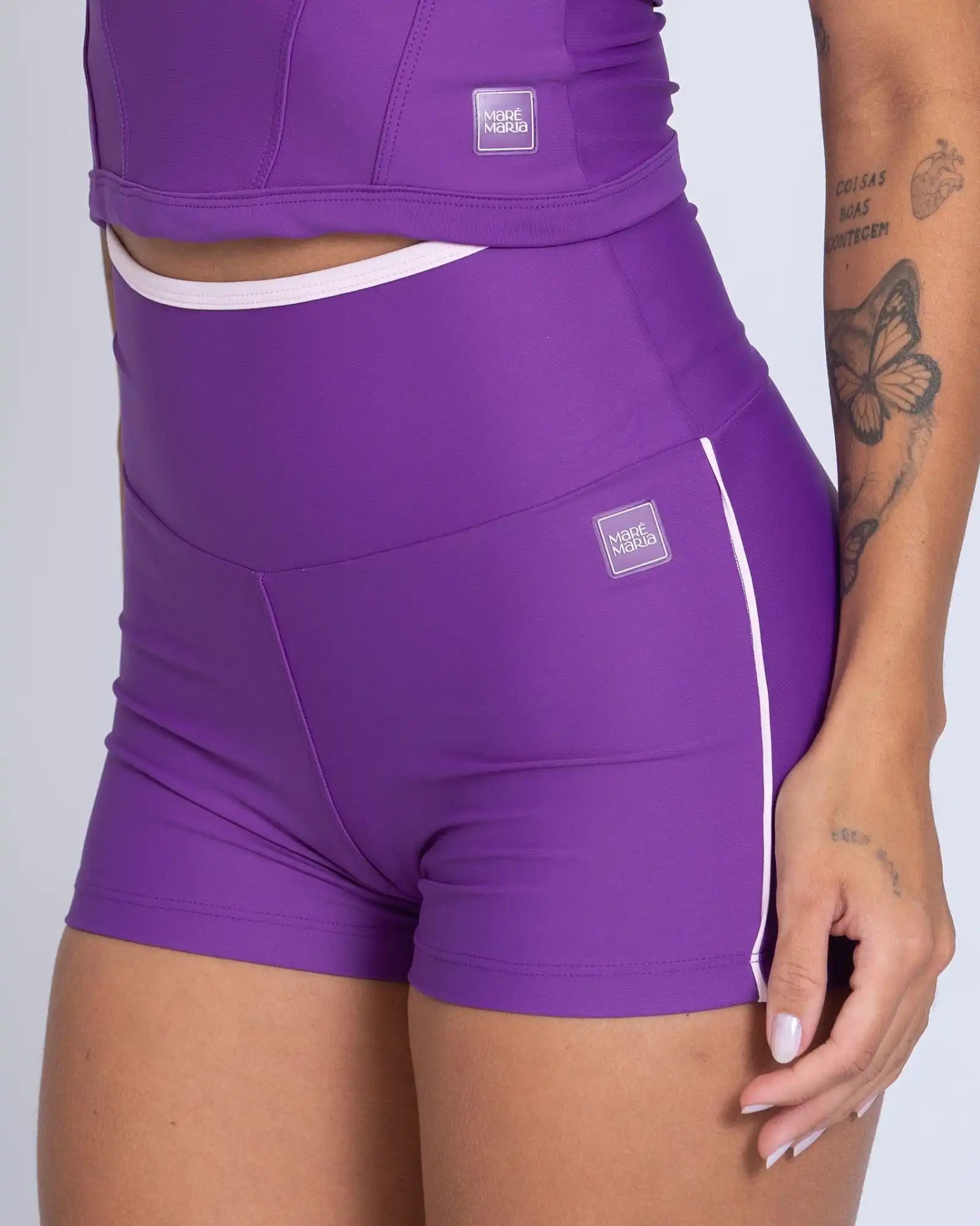 Disponível nas cores Azul Maré e Roxo Vibrante, ambos com detalhes em Rosa Blush que valorizam o visual com um toque feminino e moderno. O acabamento em viés no cós e vivo lateral alonga a silhueta e cria um contraste elegante, reforçando o DNA premium da peça.