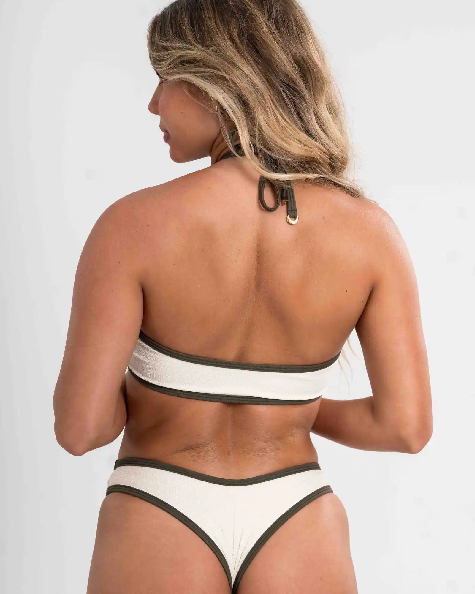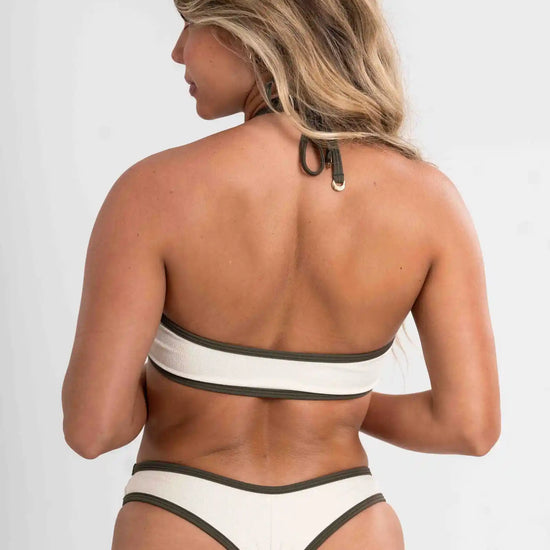 Top amarração Breeze com Lurex Off White viés Verde Musgo