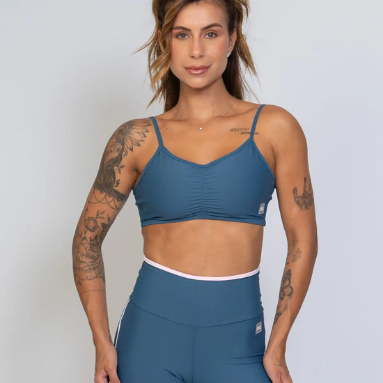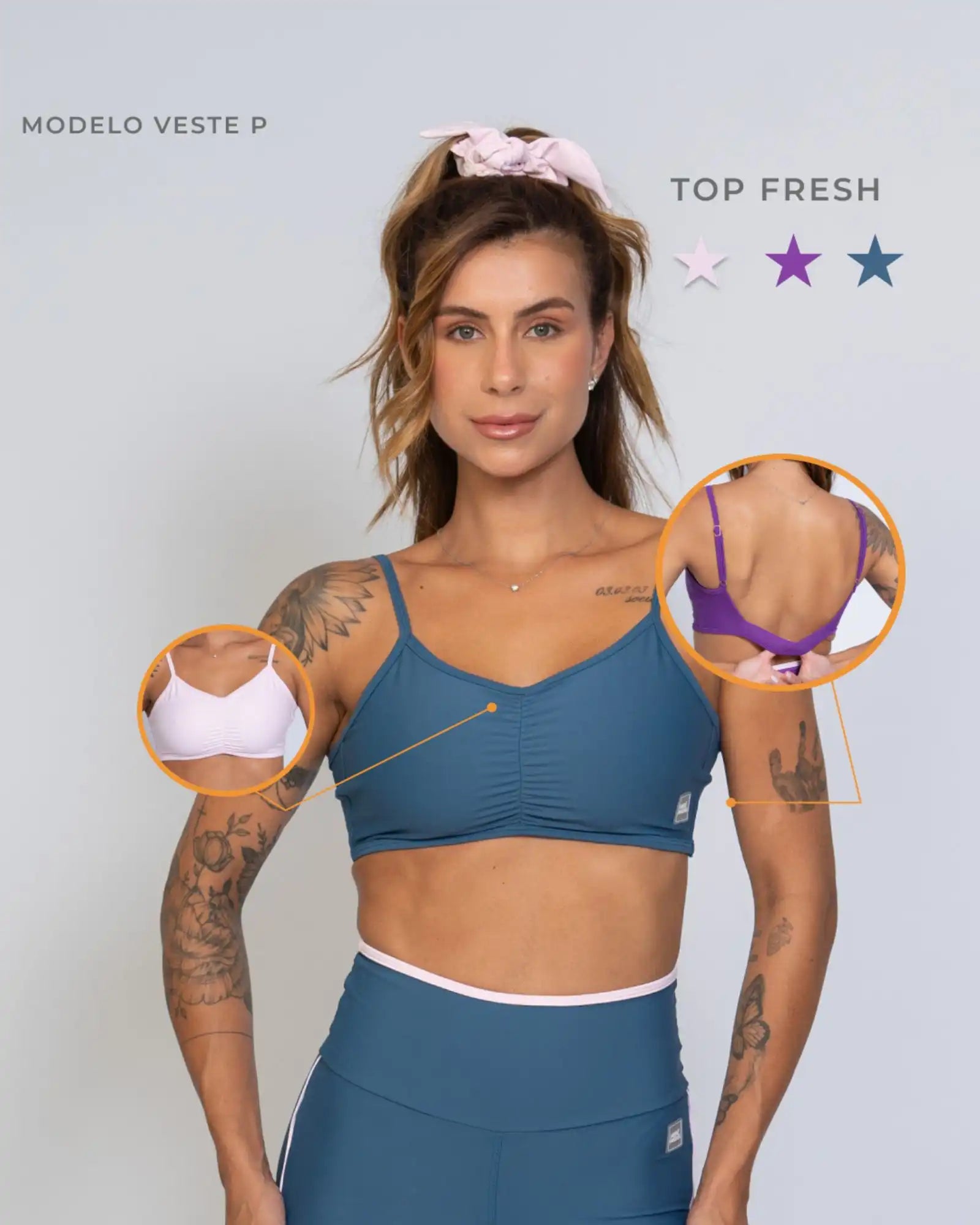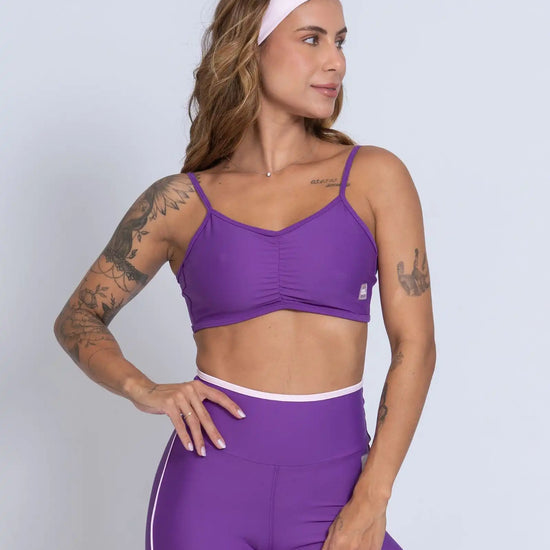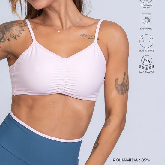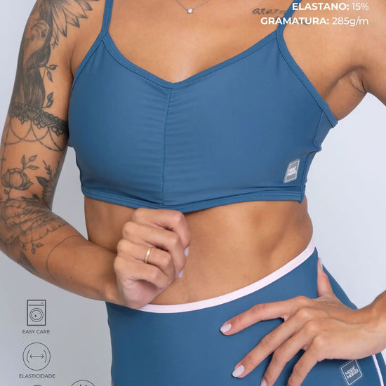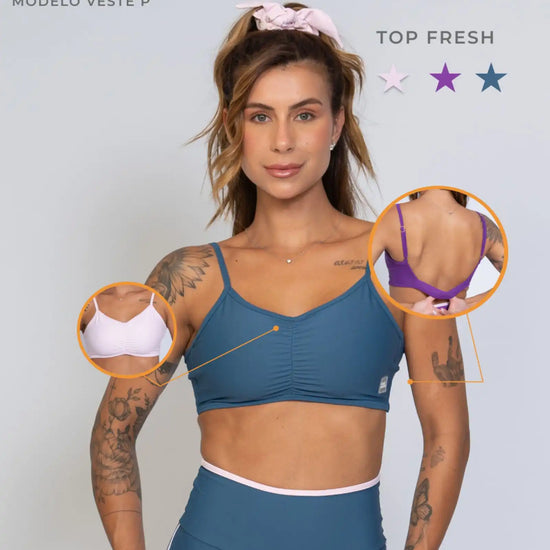 O Top Fitness Fresh é a escolha perfeita para quem busca performance, segurança e um toque sofisticado nos treinos. Com franzido frontal delicado e alças ajustáveis, ele valoriza o corpo e garante um caimento impecável, proporcionando liberdade total de movimento.