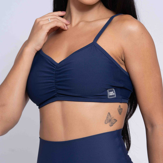 O Top Fitness Fresh Azul Marinho é a escolha perfeita para quem busca performance, segurança e um toque sofisticado nos treinos. Com franzido frontal delicado e alças ajustáveis, ele valoriza o corpo e garante um caimento impecável, proporcionando liberdade total de movimento.