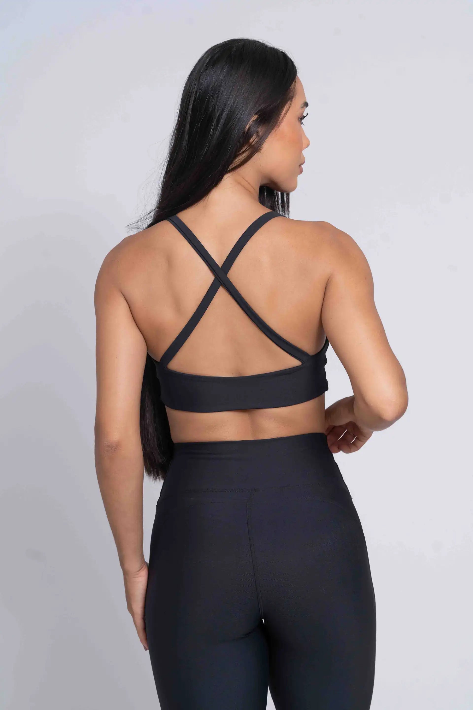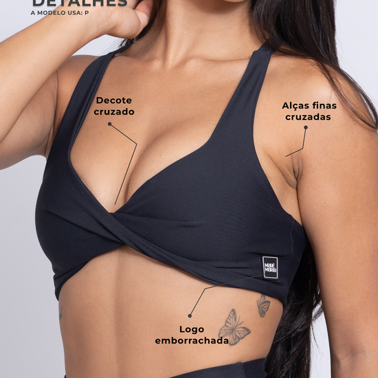 A modelagem com decote transpassado frontal realça o busto com delicadeza, enquanto as alças largas cruzadas nas costas proporcionam firmeza e liberdade para todos os seus movimentos — do funcional ao dia a dia.